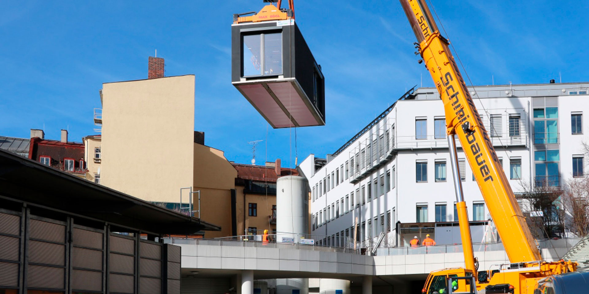 Unsere systematisierten Module konnten durch unseren maximalen Ausbaugrad ab Werk hergestellt werden und wurden bereits mit fertiger Fassade und Innenausbau nach München geliefert. Die Montage erfolgte innerhalb eines Tages.