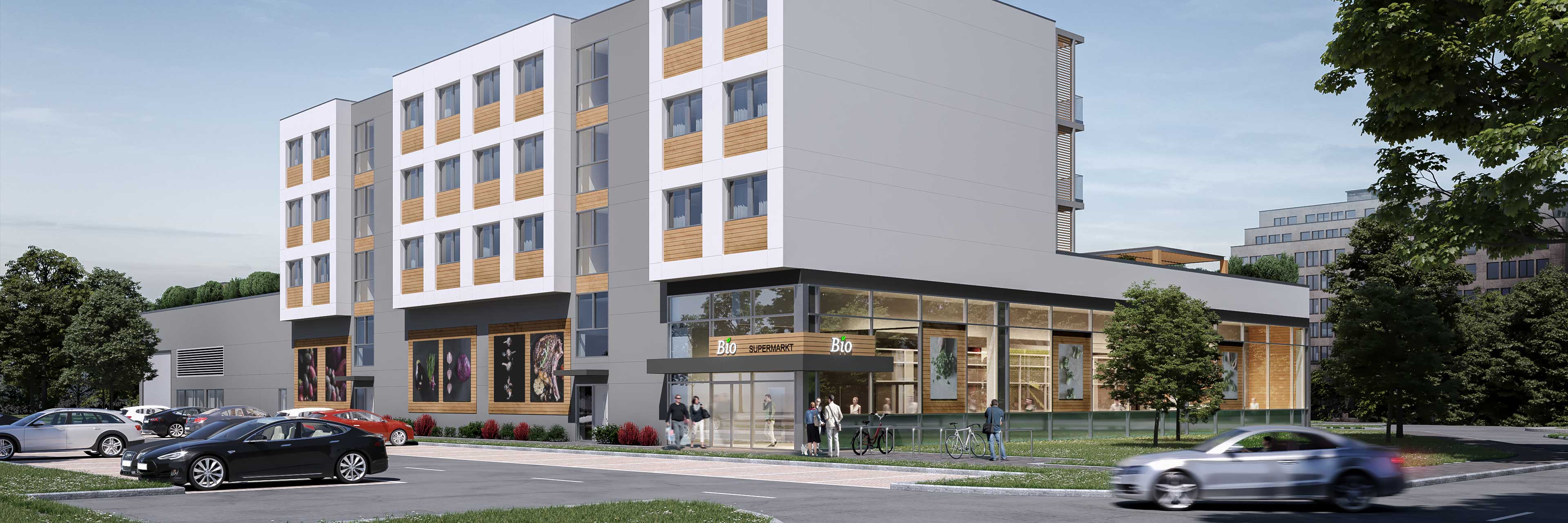 Wohnen & Einkaufen – Supermarkt mit Wohnbebauung auf dem Dach – Wohnen & Arbeiten – Bürogebäude mit Apartments